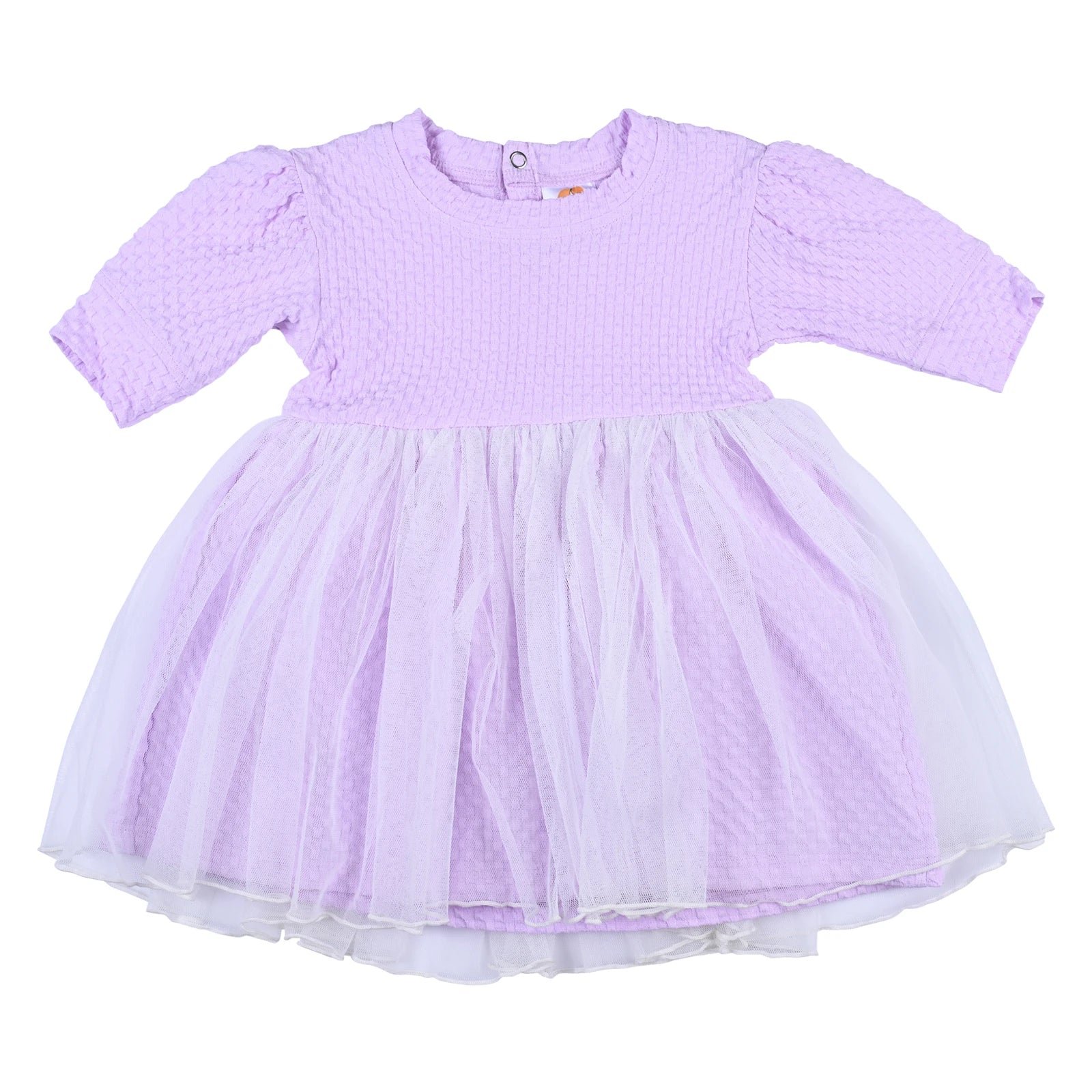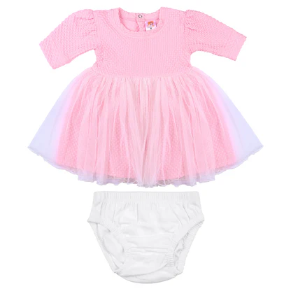 Dress your little princess in the charming Lira baby girl frock set, designed with a soft interlock top and a flowy net overlay for a graceful look. Available in lilac, green, and pink, this adorable dress comes with a matching diaper cover for complete comfort. Perfect for parties, family outings, or casual wear, it keeps your baby stylish and at ease all day long.