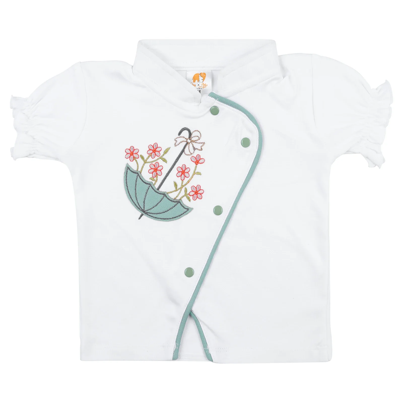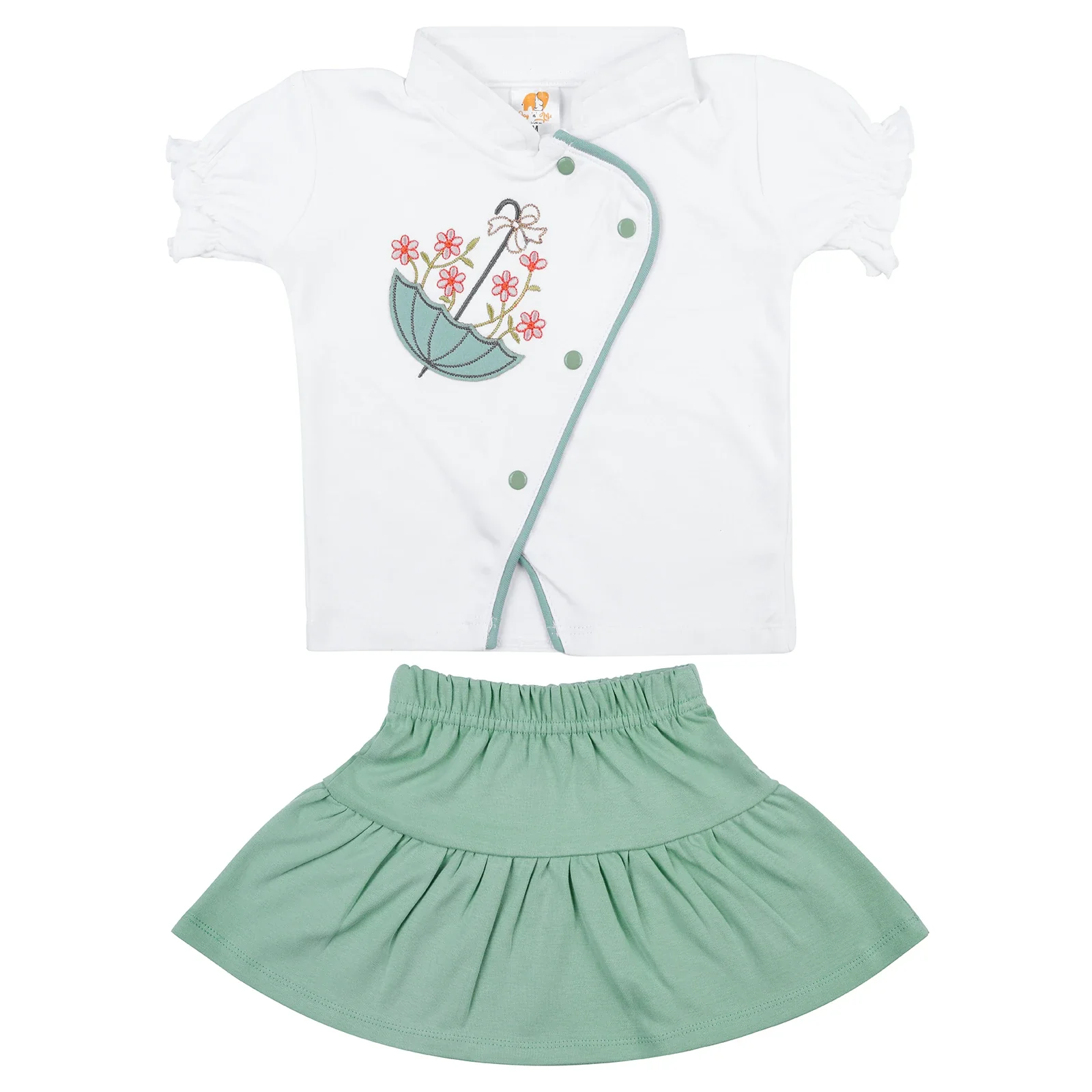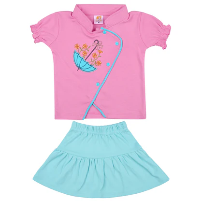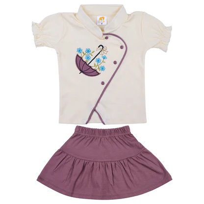 Dress your little princess in the adorable Snow baby girl set, designed for both comfort and cuteness. This two-piece outfit includes a stylish short-sleeve top with a charming floral umbrella embroidery and a matching skirt for a playful look. Made with soft, breathable interlock cotton, it ensures all-day comfort while being gentle on sensitive baby skin. Perfect for casual outings, playdates, or everyday wear, the Snow set keeps your baby girl looking cute and feeling happy.